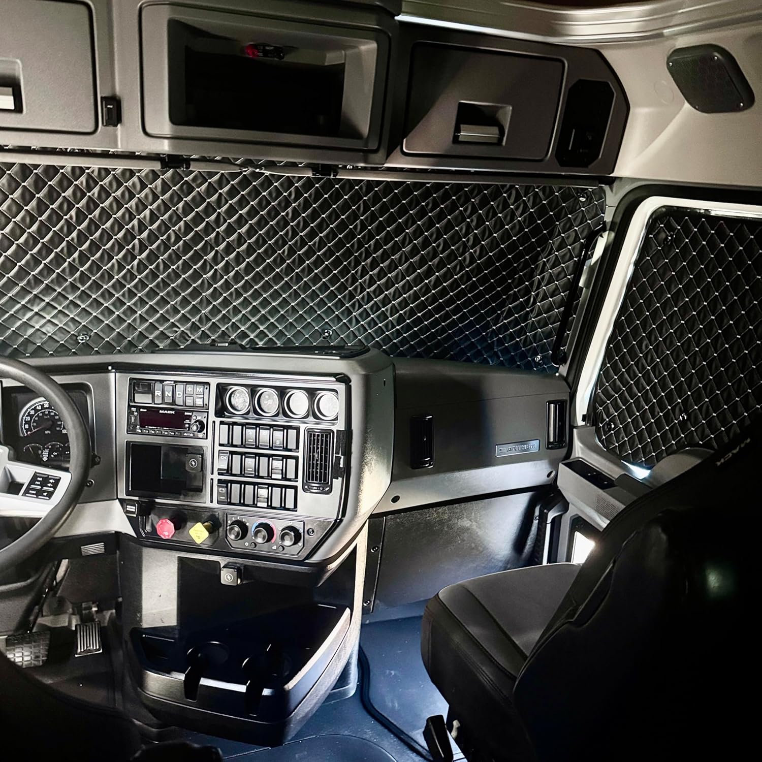 Transform your Mack Anthem cabin with this premium 3-layer insulated blackout window cover, designed to deliver superior comfort, privacy, and protection for professional drivers. The innovative triple-layer construction ensures maximum performance: Metalized silver polyester exterior reflects sunlight and harmful UV rays, lowering cabin temperature by up to 60°F. Middle foam insulation layer provides excellent thermal resistance, helping to regulate interior climate in hot and cold conditions. Interior diamond-quilted black faux leather with refined grey stitching adds a premium finish that complements your truck’s interior. This custom-fit sun shield installs in seconds with sturdy suction cups and removes just as easily, offering full blackout coverage for restful breaks and total privacy during stops. Built with durable vinyl reinforced with an aluminum layer, it withstands daily use and harsh conditions, ensuring long-lasting performance on the road. Perfect for long-haul professionals, this blackout window cover provides UV protection, heat reduction, thermal insulation, and premium cabin styling—making your Mack Anthem more comfortable year-round.