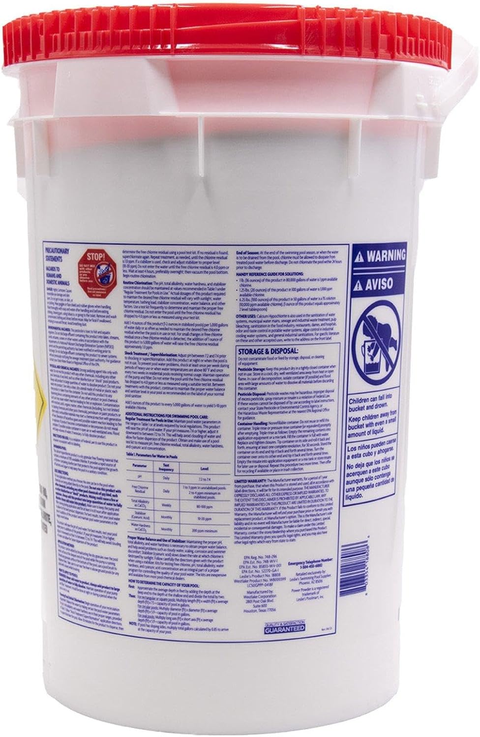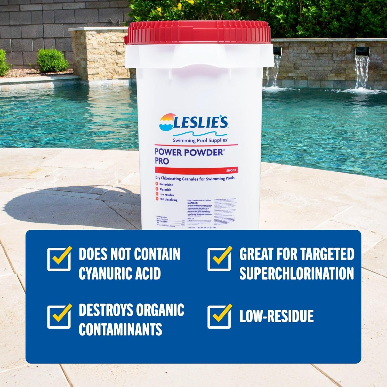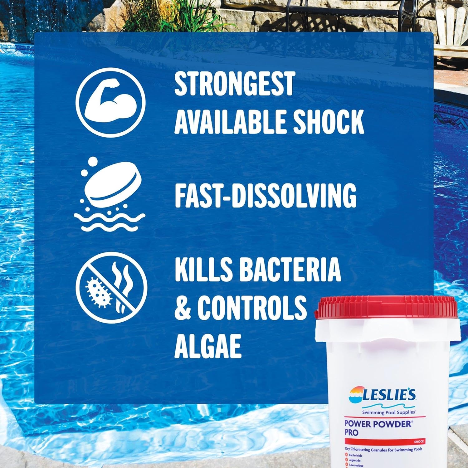 Leslie's Power Powder Pro is our strongest chlorine pool shock, featuring 73% Calcium Hypochlorite and 70% available chlorine to kill bacteria, control algae, and eliminate contaminants for clear, sanitized water. This concentrated, fast-dissolving, low-residue Cal-Hypo shock is ideal for super chlorination and routine maintenance. Non-stabilized with no Cyanuric Acid (CyA), it won't raise CyA levels and is best used in the evening to reduce UV degradation. Dosage: 9-18 oz. per 10,000 gallons provides 5-10 ppm available chlorine. Perfect for treating algae blooms and maintaining safe swimming conditions. Product packaging may vary, with no change to product composition or weight.