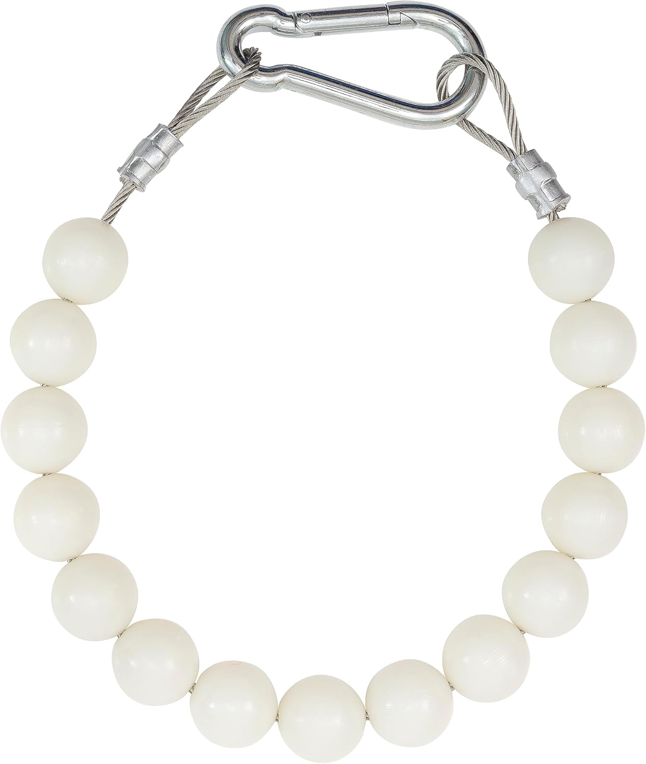 Stainless Steel Aircraft Cable, aluminum crimps, 1" nylon white balls - 5" and larger have additional crimps, stainless steel thimbles, and a quick link.