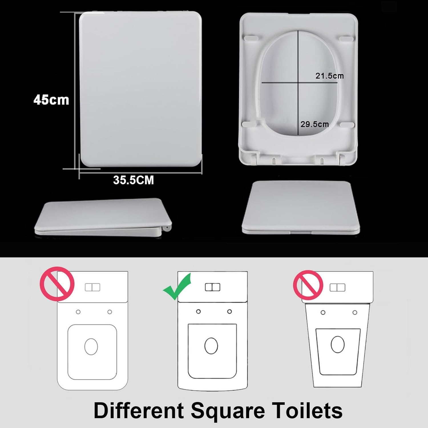 Maintenance Periodical maintenance Wipe gently with wet fabric. Wipe off smut. Watch it with neuter cleaners (such as soap powder) and than dry it with clean fabric. Specifications: Product Type: Soft Close Toilet Seat Square Colour: White Shape: Square Toilet Seat Material: polypropylene Square Toilet Seat Features: 1. Quiet-Close & Soft Closed feature helps prevents slamming. 2. Quick release, easy and proper cleaning. 3. Nonslip seat bumpers keep the seat from shifting. 4. Simple and time saving installation. 5. Top Quality Made, Ergonomic Design for Comfort Resistant to staining, fading, chipping and peeling. Package Includes: 1 x Square toilet seats (with fittings)