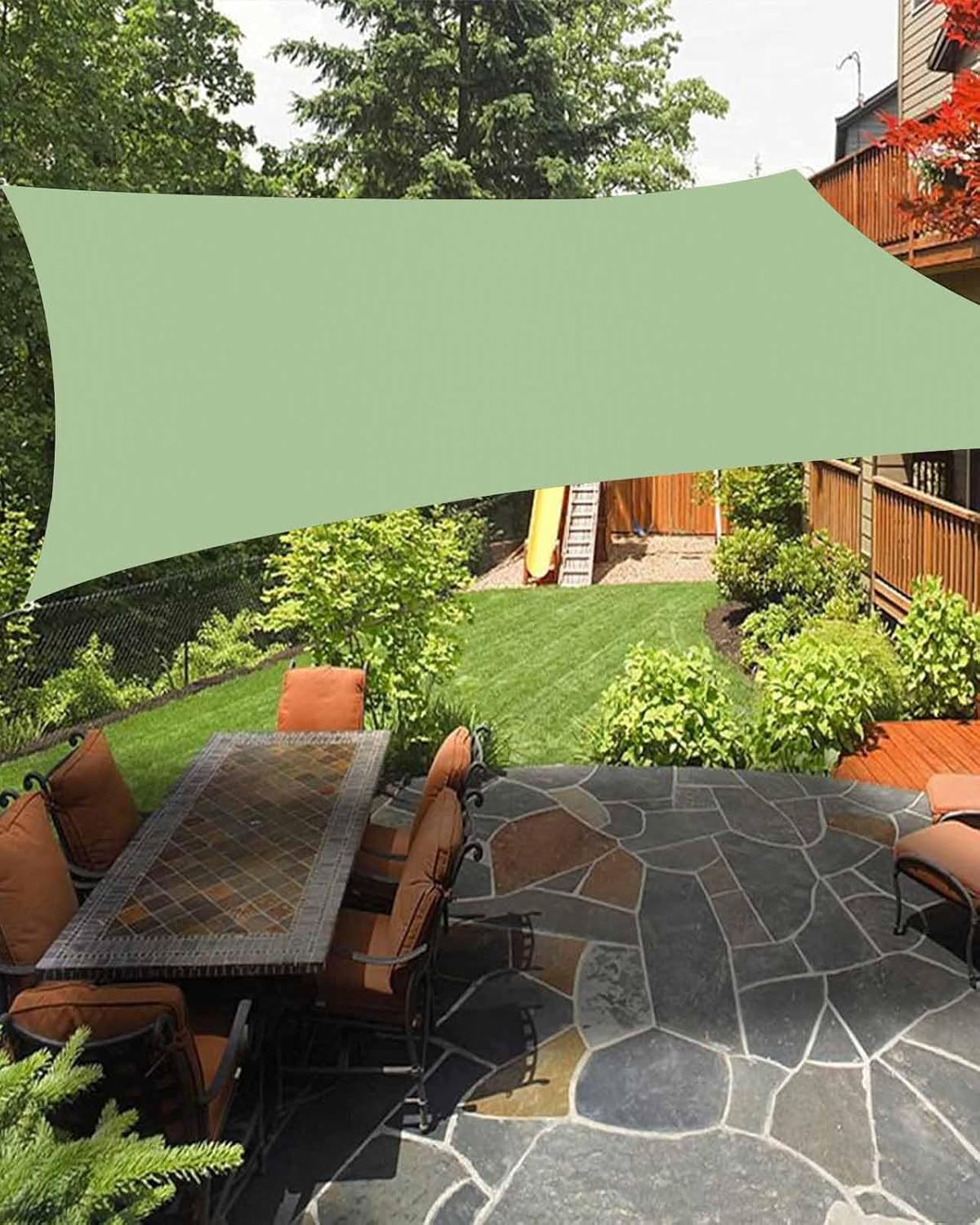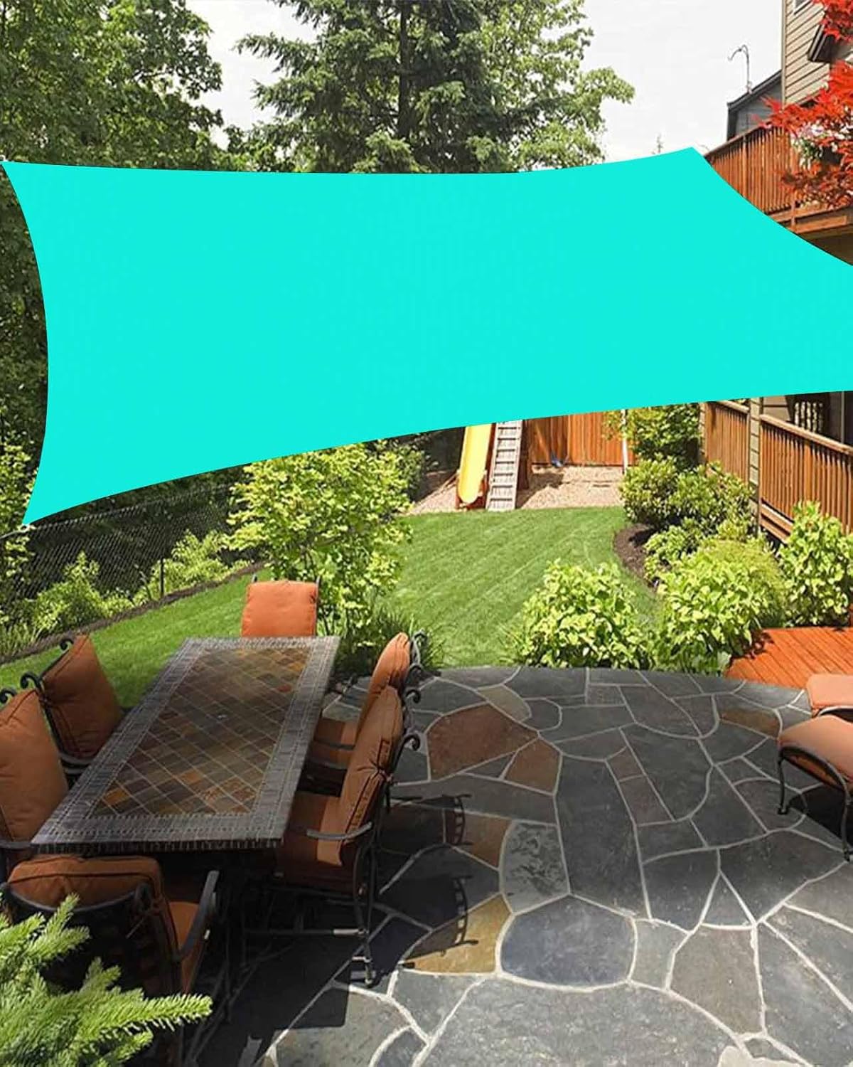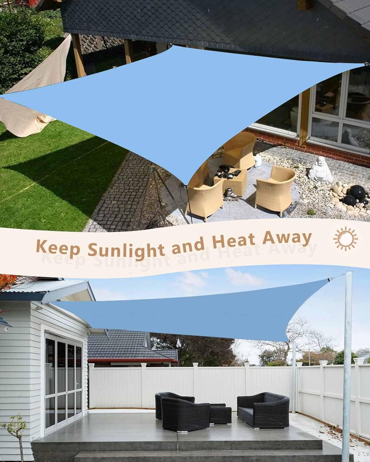 Create your cool outdoor space and have a great outdoor relaxing time with our sun shade sail.Size6.5x10 ft / 8x10 ft / 12x16 ft / 14x18 ftPackage1 x sun sail shade (sewed 4 D-shaped metal rings on the corners)4 x sturdy ropes (measure 3 meters)Shape: RectangularHow to InstallFind four suitable installation points, such as rooftops, trees, pillars, fences, etc.Leave a gap of 1.5-2 feet between the fixed points and the shade sail.Choose two sides higher than the others for better performance and appearance.Premium & Breathable MaterialMade from high-quality, tear resistant, sun resistant, sandproof and strong durability. The sun sail shades canopy can block strong UV rays and protect from direct sunlight exposure. With breathable fabric, it allows a cooling breeze to pass through.Exquisite WorkmanshipDouble Layer Webbing is used to prevent fraying or tearing and to provide extra protection throughout the hem of the sunshade sails. This double layer webbing is also used to stabilize the D-rings on each corner of the Sunshade Sail.Multiple OccasionSail shade cover suitable for patio, backyard, garden, balcony, pergola, deck, pool, beach, porch, lawn, playground, RV, camping, garage and other places.Ideal Patio DecorThe outdoor sunshade is available in multiple colors and sizes to suit your different styles and needs, making it an ideal choice for outdoor decoration.Wash TipsRecommend hand wash than machine wash, you can clean a sunshade sail by gently scrubbing it with a mild soap and water solution. Do not blanch.